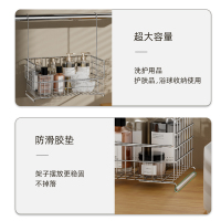 产品材质是304不锈钢,具有防水防潮、防生锈、抗腐蚀性、硬度高特点 免打孔悬挂于杆子上使用,也可台面使用 大容量收纳洗护品 表面处理: 亮光